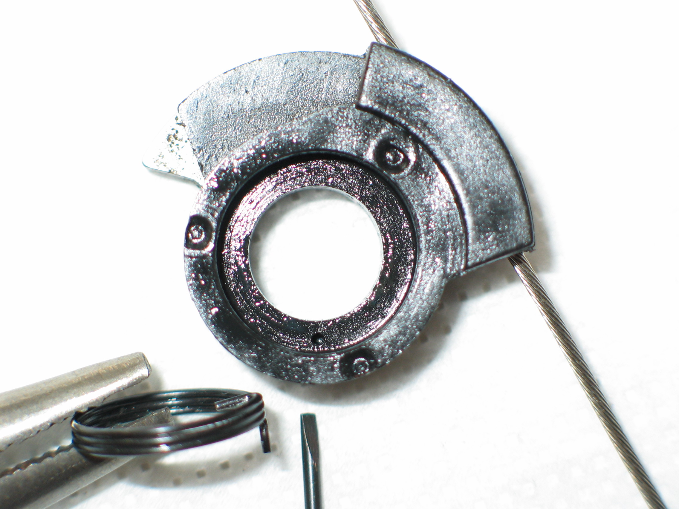 The shift cam and shift cam return spring. The tip of the screwdriver is pointing to the hole where the tab from the spring connects to the cam.