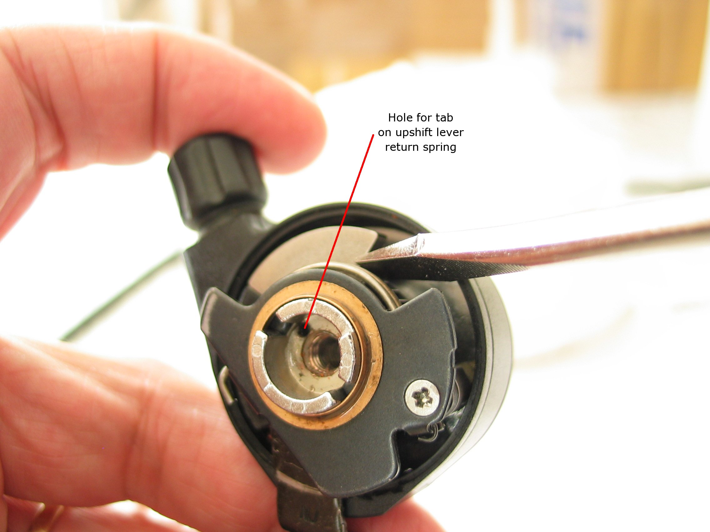 Using a flat-bladed screwdriver, rotate the shift cam counterclockwise as far as possible to make room for installing the upshift pawl.