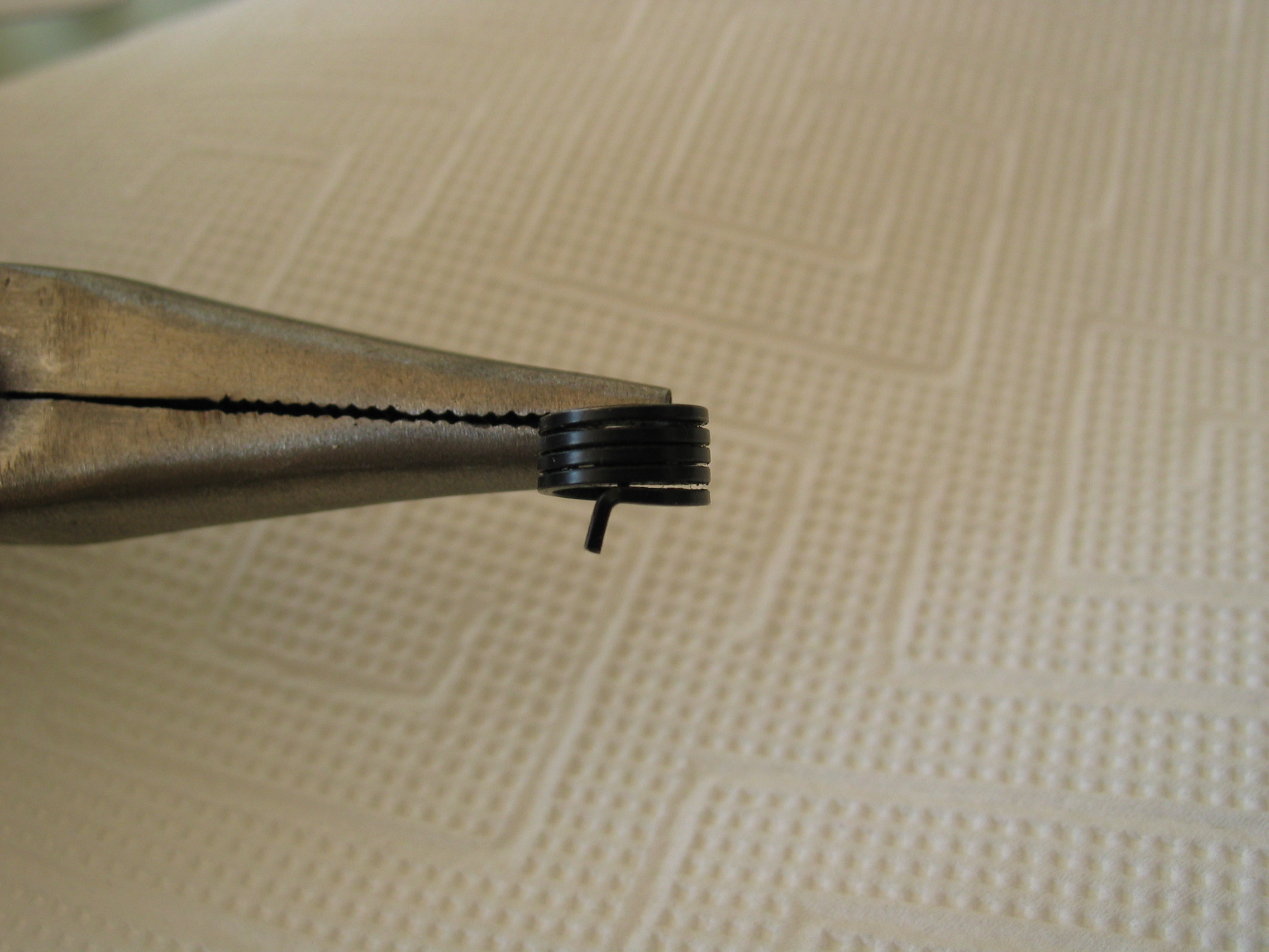 Bending the upshift lever return spring. To keep the upshift spring from popping out of place during reassembly, I had to bend both tabs quite drastically using needlenose pliers. This photograph shows the final angle of the lower tab. The tab is on the side closest to the camera, so that the bend in the wire is less than 90 degrees.