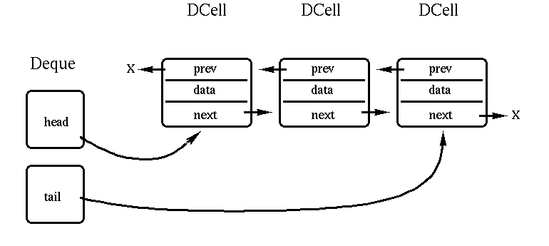 A double-ended queue, or Deque (pronounced "deck"), is a list in which elements may be added or removed from both the head and the tail. Consider the implementation of a Deque in the form of a doubly-linked list, depicted in the following diagram, which shows a Deque consisting of three DCells. Note that the "prev" member of the DCell that is the head of the Deque is null, and the "next" member of the DCell that is the tail of the Deque is also null. Note that an arrow pointing to an X indicates a null reference.