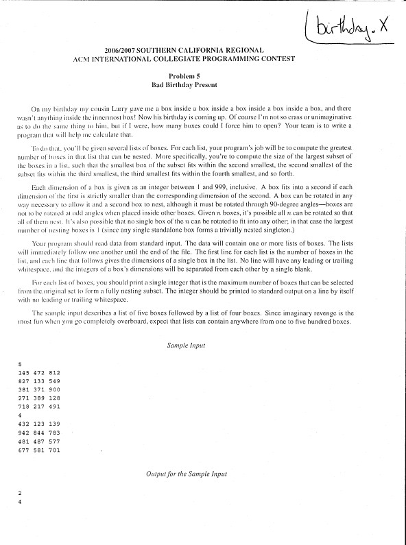 | NAMES \ PROBLEMS | birthday | bookcase | candycorn | circuses | forward | frogger | gene | getout | gumbo | honey | key | marbles | missing | moving | multiple | ncredible | orchard | other | panic | rube | shipping | spf | sq | syntax | treasure | walking | window |