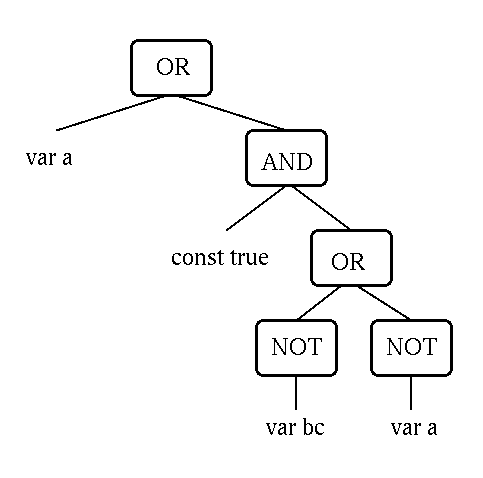 (OR (var a) (AND (const true) (OR (NOT (var bc)) (NOT (var a)))))which represents the parse tree