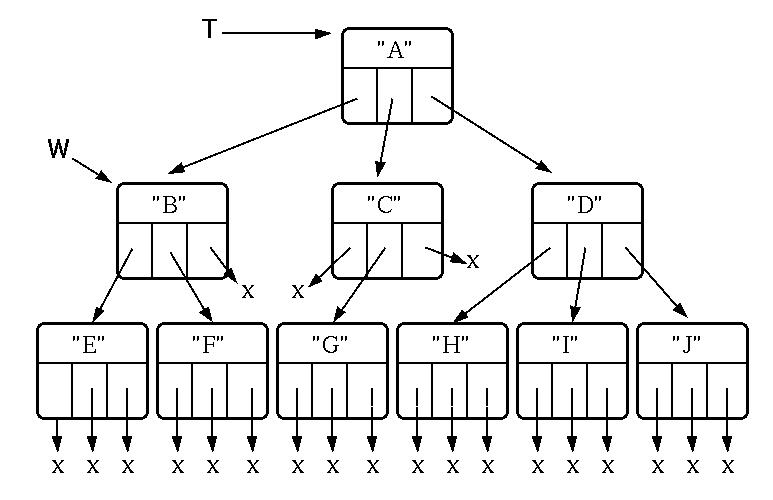 A ThreeTree holds a piece of data and is the root of a tree with three children. Note that a ThreeTree is really just a single node that may have nonnull children that are ThreeTrees themselves. There is no need for a separate ThreeTreeCell class, since a ThreeTree is, in effect, a ThreeTreeCell. In the illustration, the reference T refers to a ThreeTree. The reference W refers to the ThreeTree that is T's leftmost child.