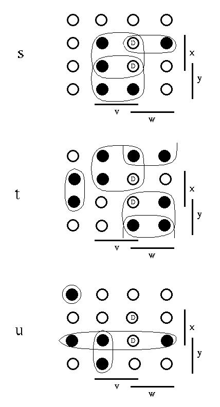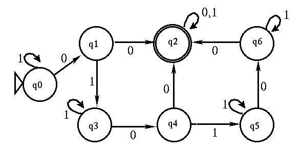 Encode the states in the above DFA with the 3-digit binary representations of their labels. We encode the transition characters with their values, since they are single-bit quantities already. Then the following table represents the I/O behavior of our NeuroToast circuit: Old State Input New State --------- ----- --------- vwx y stu <-- bit names 000 0 001 000 1 000 001 0 010 001 1 011 010 0 010 010 1 010 011 0 100 011 1 011 100 0 010 100 1 101 101 0 110 101 1 101 110 0 010 110 1 110 111 0 don't care 111 1 don't care This table leads to the following Karnaugh maps, which have simplified representations of s: vx + vy + wxy' t: vy' + wx' + wy + v'w'x u: v'w'x'y' + vw'y + xy The circuit is left to the ambitious reader (or test taker).