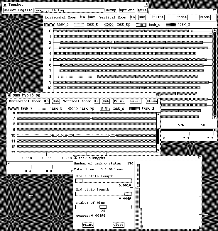 It shows parallel time lines with process states, like one of the paraGraph [8]. The view can be zoomed in or out, horizontally or vertically, centered on any point in the display chosen with the mouse. In Figure 1 , the middle window has resulted from zooming in on the upper window at a chosen point to show more detail. The window at the bottom of the screen show a histogram of state durations, with several adjustable parameters.