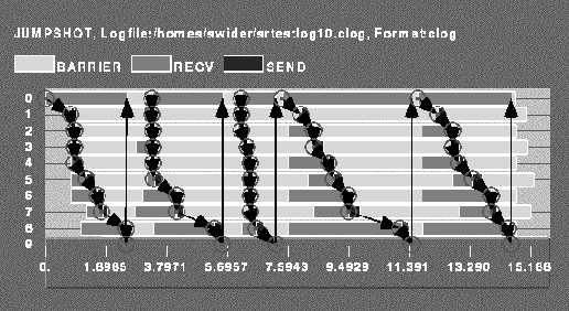 Another tool that is new and is now available is called Jumpshot, which has evolved from Upshot and Nupshot. Jumpshot, which is written in java, is a graphical visualization tool for interpreting binary clog tracefiles which displays them onto a canvas object, such as the one depicted in Figure 2 .