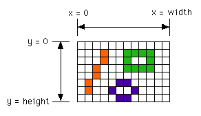 A graphics context draws in a rectangle made up of pixels. A position in the rectangle is specified by a pair of integer coordinates, (x,y). The upper left corner has coordinates (0,0). The x coordinate increases from left to right, and the y coordinate increases from top to bottom. The illustration on the right shows a 12-by-8 pixel component (with very large pixels). A small line, rectangle, and oval are shown as they would be drawn by coloring individual pixels. (Note that, properly speaking, the coordinates don't belong to the pixels but to the grid lines between them.)