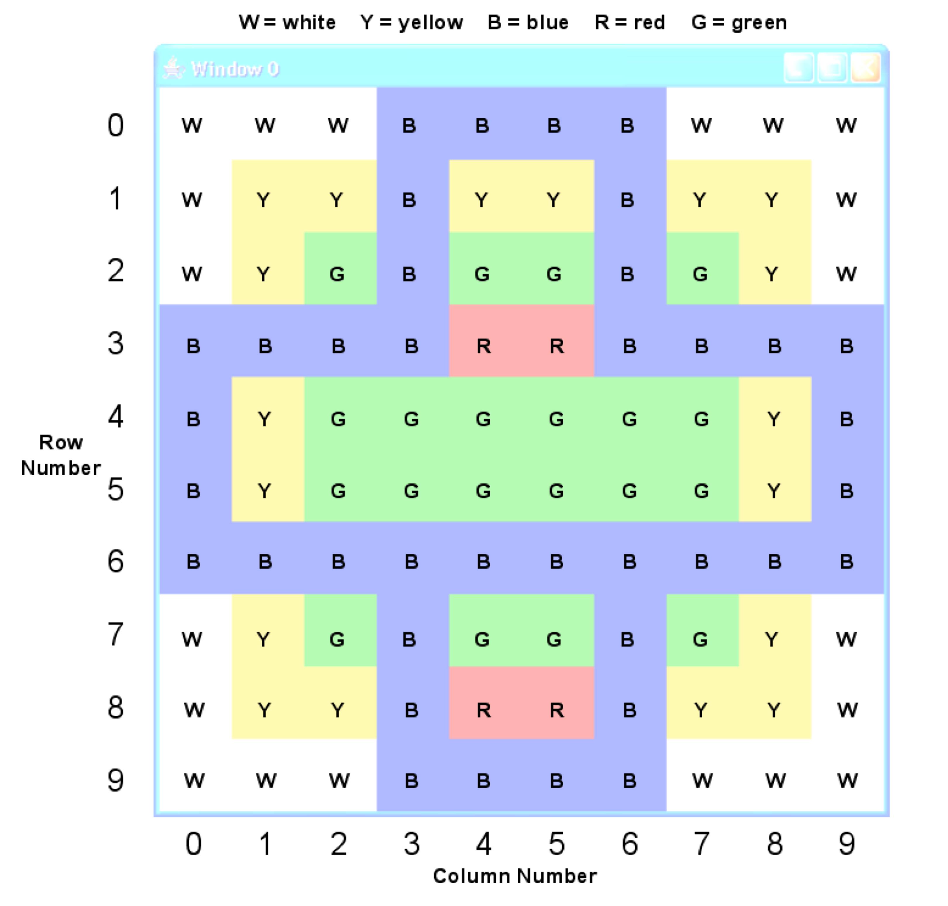 In this problem, you'll be writing a program to display rectangles on a drawing canvas. The goal is to create a particular picture, shown in the image below. Although there are row and column numbers in the picture, they are just for reference here -- they're not in the actual program. Also, since you may be reading this on a black-and-white printout, the second image has letters to indicate what each color should be.