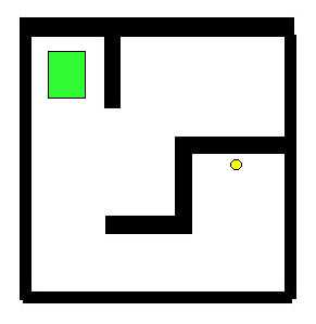 The first trial will involve a setup like the one below. This maze will be available for testing at least a week before the end of the project. The robot is indicated by the green rectangle (positioned upper left, facing toward the wall at the bottom of the diagram), and the candle is represented by the yellow circle (in the middle on the right).