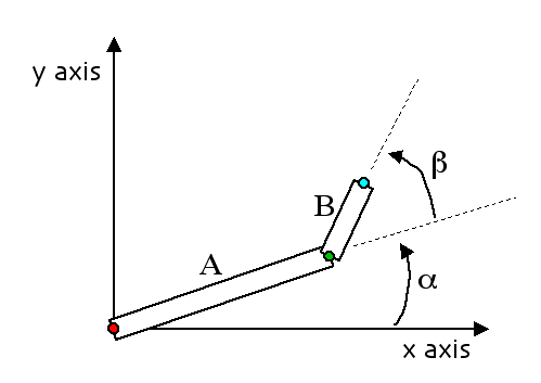In this example, the first joint of a two-link robot is the red point, where a Cartesian coordinate system has been attached. The length of this first link is A and the joint angle that the first motor has currently achieved is alpha. At the end of A, a second link is attached (the green point, if you're looking at this in color). This second link is of length B and is oriented at an angle beta from the first link. The end effector of the arm is indicated by the last point (blue in the color diagram). Finding this robot's kinematics is the problem of finding the location of this end effector in (x,y)-coordinates, given alpha and beta, A, B,