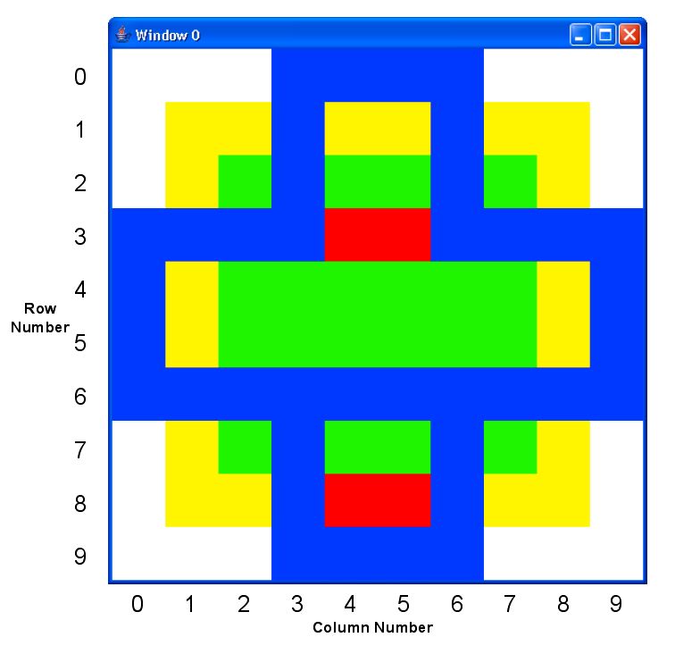 Java offers lots of support for graphics. In this problem, we're explicitly using the built-in colors that Java offers -- they are listed at the bottom of the CS5App.java file. You won't need colors other than Color.green, Color.red, Color.yellow, Color.blue, and Color.white for this problem. (It's possible to mix your own colors by specifying different amounts of red, green, and blue -- click on this page (http://java.sun.com/j2se/1.4.2/docs/api/java/awt/Color.html), if you're interested and have a bit of Java background already.)
