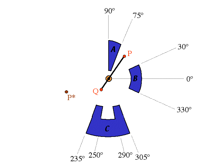 In this picture, the obstacles are composed of circular arcs centered at the armature's axis and straight line segments extending radially from that center. The near arc of obstacle A is 2 mm from the center, obstacle B is 5 mm away, obstacle C's horns are 7 mm away, and obstacle's C's "indentation" is 9 mm from the center. Also, P and P* are both 8 mm from the center. The armature is 10 mm long.
