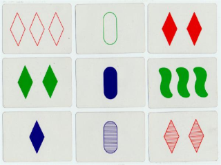 People tend to find the identification/labeling of the cards trivial, e.g., "That card has two green filled-in diamonds." However, finding three cards that consitute a legal set from among a collection of randomly-chosen cards can be tricky. In contrast, it is much simpler to create a program to find a set (or all sets) among some labeled cards than it is to actually determine the appropriate label. This problem asks you to wirte a program that handles both of these tasks. Afterwards, you should be able to play against your computer in the game!