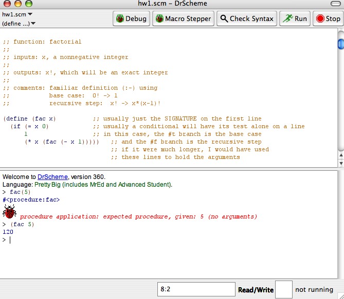 (Using the built-in test facility of Dr. Scheme is not recommended, as it will make your source file not readable as test.