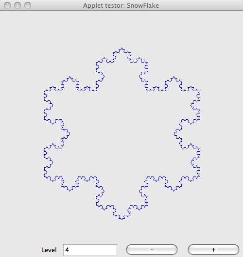 The user presses the button labeled "+". The subdivision level is incremented by 1, as reflected in the display, and the Koch snowflake plot is redrawn at the new subdivision level. If the subdivision level is at its maximum value, nothing happens.