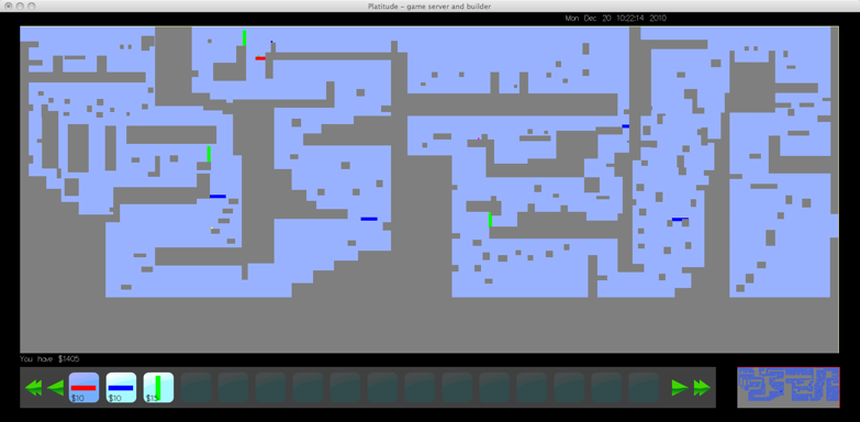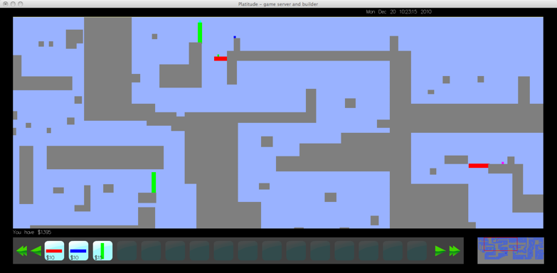 The builder uses currency to buy obstacles that it places on the map to prevent the platformer from getting to the end of the level. To buy and place an obstavle, he player clicks on the corresponding button in the bar at the bottom of the screen, and then cliks in the map at the obstacles desired location. The map display interface provides a full view of the level, with the ability to zoom in on any part. The builder can see the platformers' progress in real-time. The interactive minimap shows the relationship between the current map display and the whole level area. The player can click in the minimap to move the map display widow in the level.