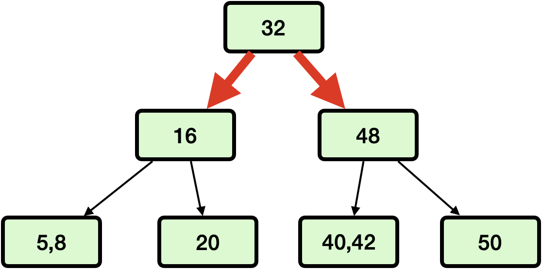 Notice that we've marked the edges between the three nodes that were part of our original 4-node by making them bright red and thicker. That's our way of remembering that those nodes were acting like a single unit. If we wanted to, we could convert the BST with these “super edges” back into the original 2–3–4 tree!