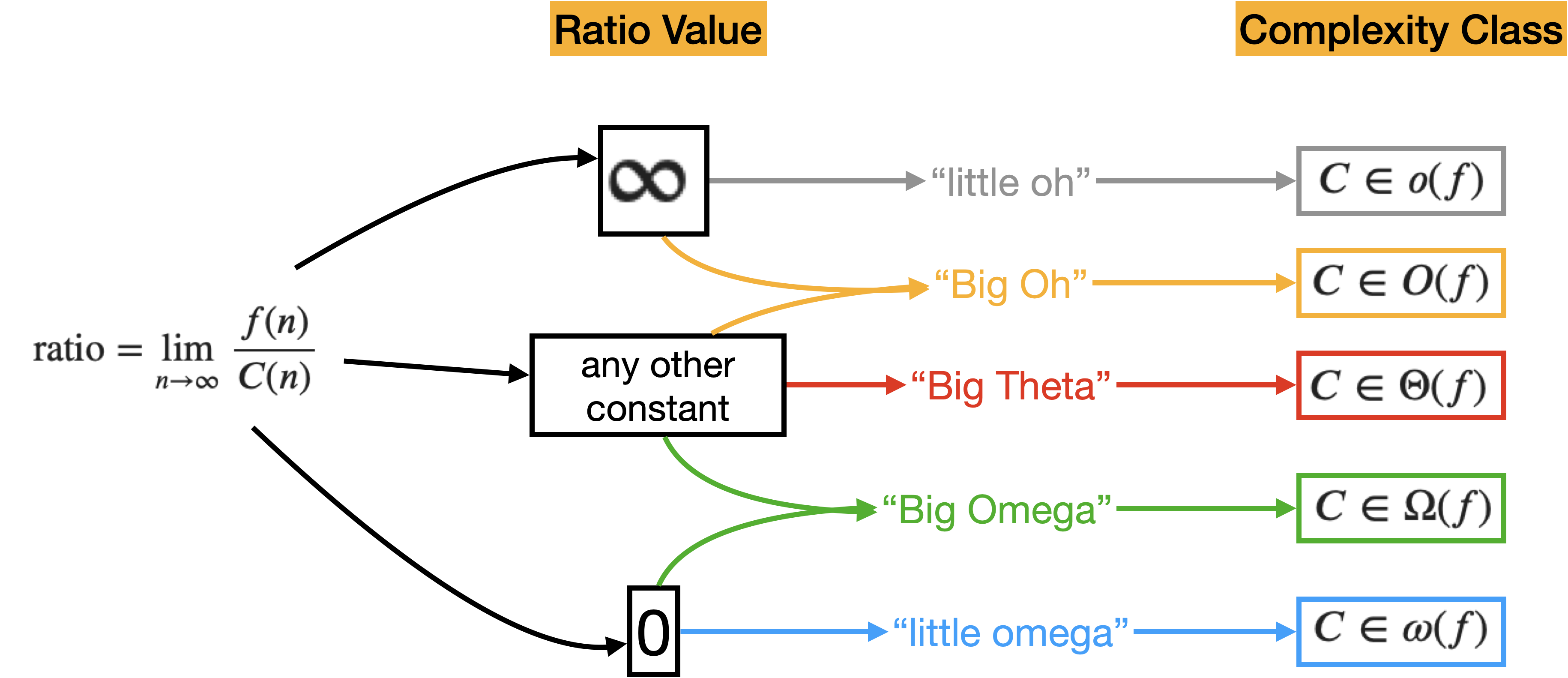 Remember that we can compare the behavior of two functions for infinitely large inputs using \( \mathrm{o}, \mathrm{O}, \Theta, \Omega, \text{ and } \omega \).