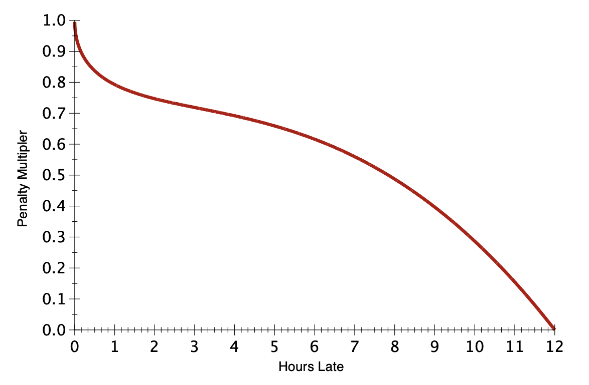 This function is swift to penalize lateness—even one minute late results in a lateness multiplier of 0.964 (i.e., a 3.6% penalty). At nine minutes late, the multiplier is 0.9, a 10% penalty. But with time the rate slows down, the 0.8 point is reached at a little before the first hour, and the 0.6 multiplier is not reached until the work is about 6.5 hours late. At, and beyond, the 12-hour point, the multiplier is zero. Times are based on the time that the submission process finished, not when you began submitting. For assignments due at 11:59 pm, we count late minutes from midnight and round down to whole numbers of minutes. Thus, you have about two minutes of grace after the clock ticks over to reading 11:59 pm. (It is, of course, risky to cut things close, especially since the submit system takes time to perform its work.)