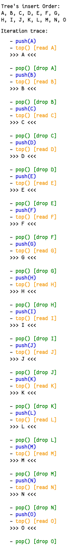 Our iterator will print out the values in the tree in sorted order (A, B, C, D, E, F, G, H, I, J, K, L, M, N, O) but the debugging traces below show what goes on behind the scenes to make that happen for each of these differently shaped trees: