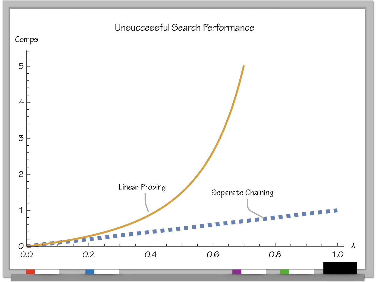 So really, although we've been labeling them both \( \lambda \), the “load factor” has different meanings for the two different kinds of table! I guess we should have been tipped off before, because \( \lambda \) can be anything for separate chaining, but for open addressing, \( \lambda \) can never be greater than one.
