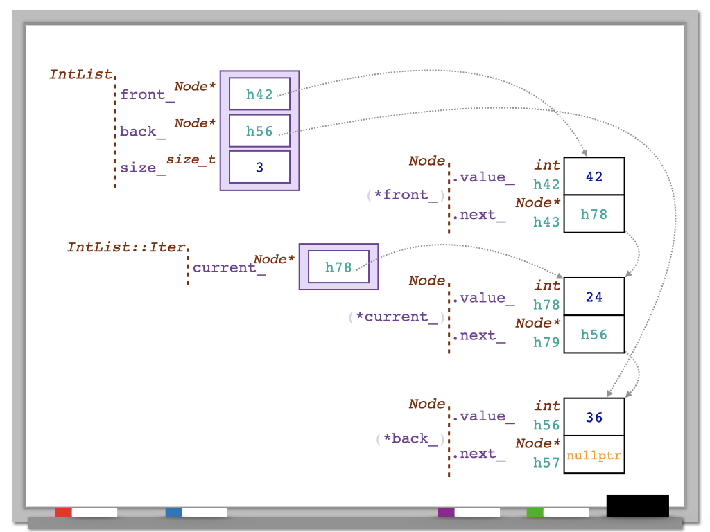 Recall that an IntList::iterator is a custom class that behaves like a pointer to an int from the perspective of the operations it provides (*, ++, etc.) but is not actually a pointer to an int; it is our own custom class. It might be tempting to say that the iterator “points to” something, but that might be confusing, so we'll adopt the following terminology: