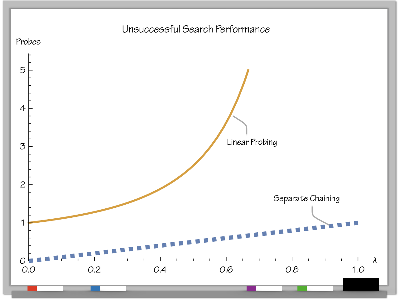 Hay! The line for quadratic probing continues on all the way to 1, but that method could get stuck in a loop if \( \lambda \) goes beyond 0.5!