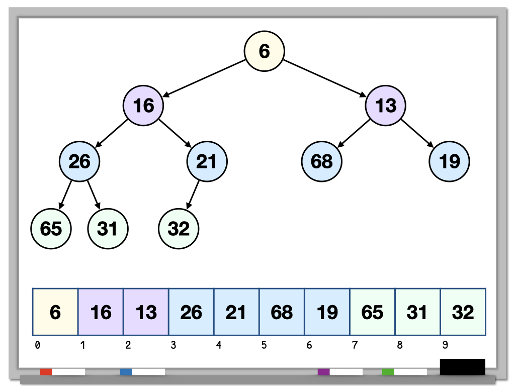 Although we visualize a heap as a binary tree, in practice we don't usually encode it using nodes and pointers.