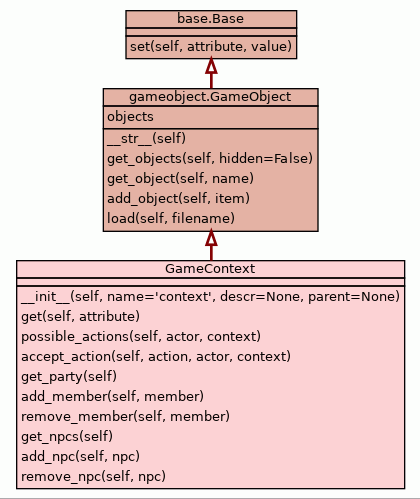 A GameContext corresponds to a geographic location and is a collection of GameObjects, GameActors and state attributes. They exist in higherarchical relationships (e.g. kingdom, village, buiding, room).