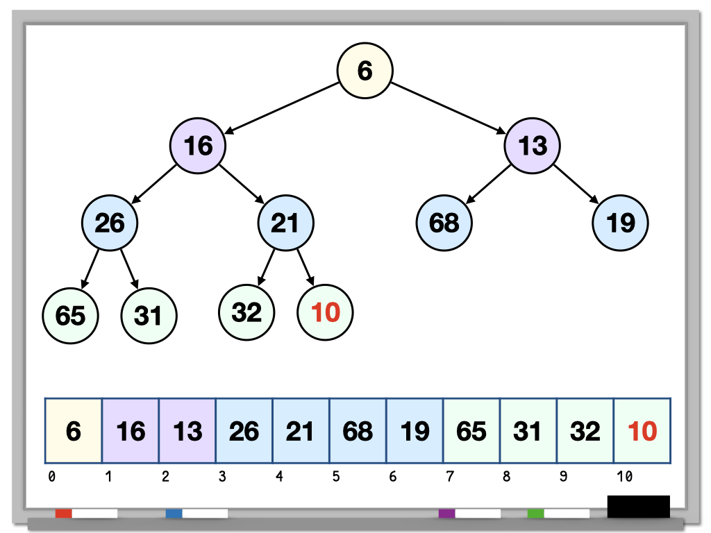 Start with the heap pictured above (after we inserted 10) and, on paper, insert 20. (You can just draw the tree alone without the array representation; the array representation is easiest for a computer in its memory but the tree is easier for us to think about.)
