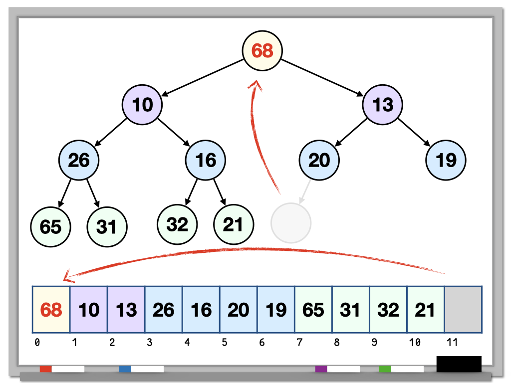 - Replace the root (index 0) with the last element in the heap (index n - 1).