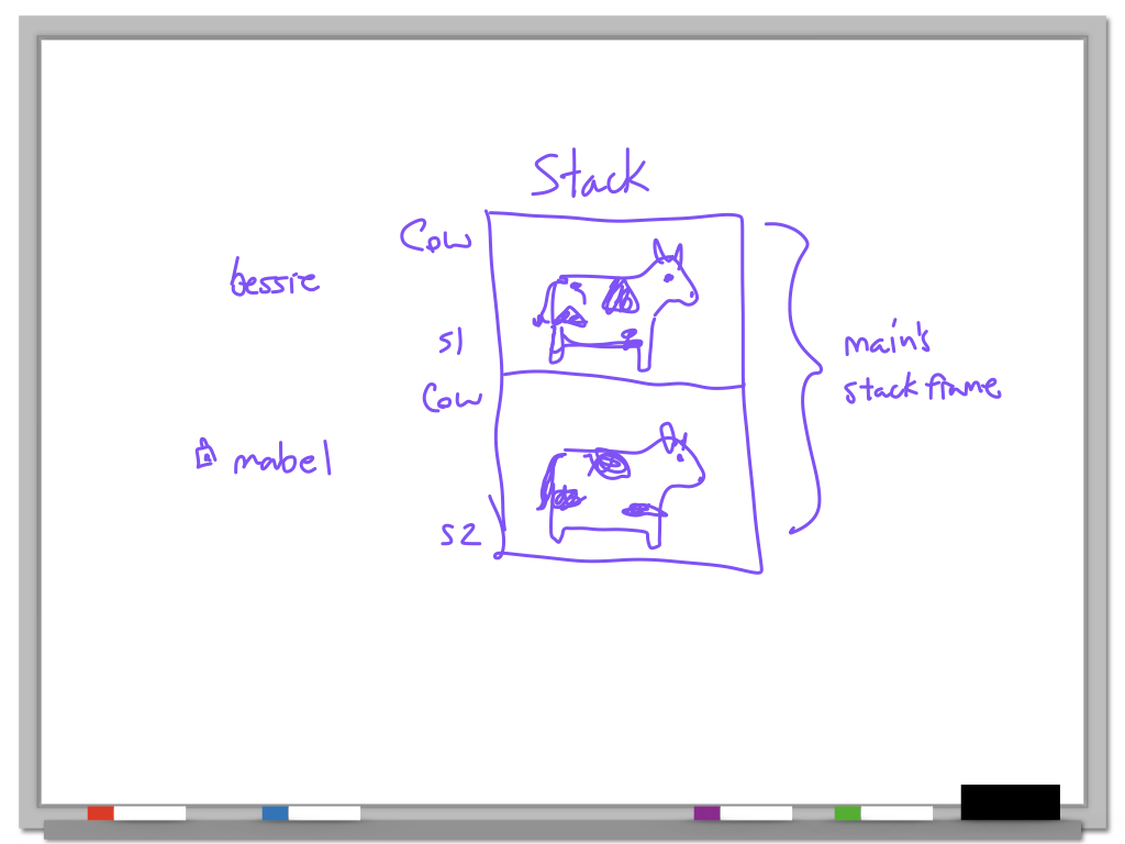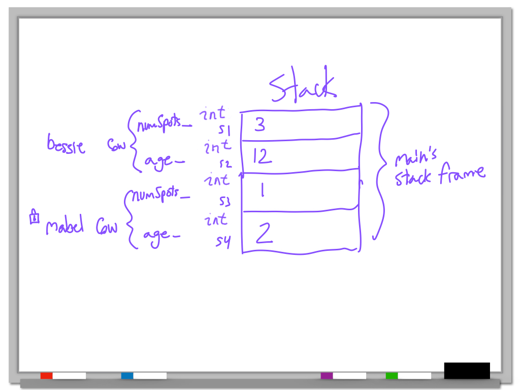 When it's important to keep track of the values of the member variables, we can draw objects as groupings of variables, which is basically how objects are actually arranged in memory! When you allocate space for an object, you are actually allocating space for all of its member variables (and a few more bookkeeping things that we won't bother to model).