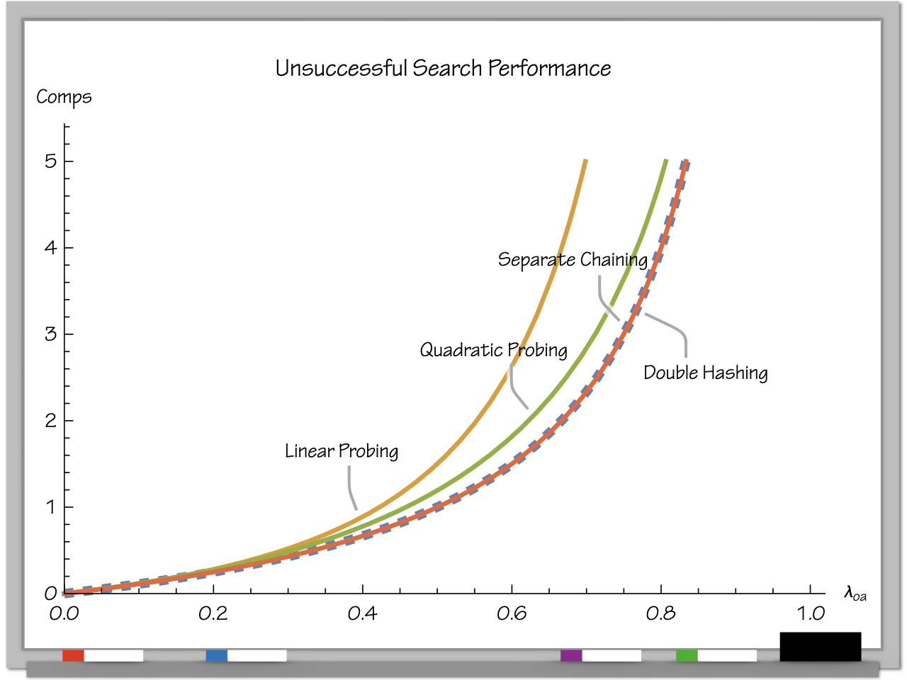 Hay! The line for quadratic probing continues on all the way to 1, but that method could get stuck in a loop if \( \lambda \) goes beyond 0.5!