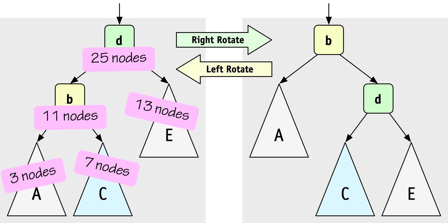 Draw this tree yourselves and see how the sizes of b and d change when you do a right rotation at d. How much did they change by? Can you see where that number comes from? Can you generalize that…?