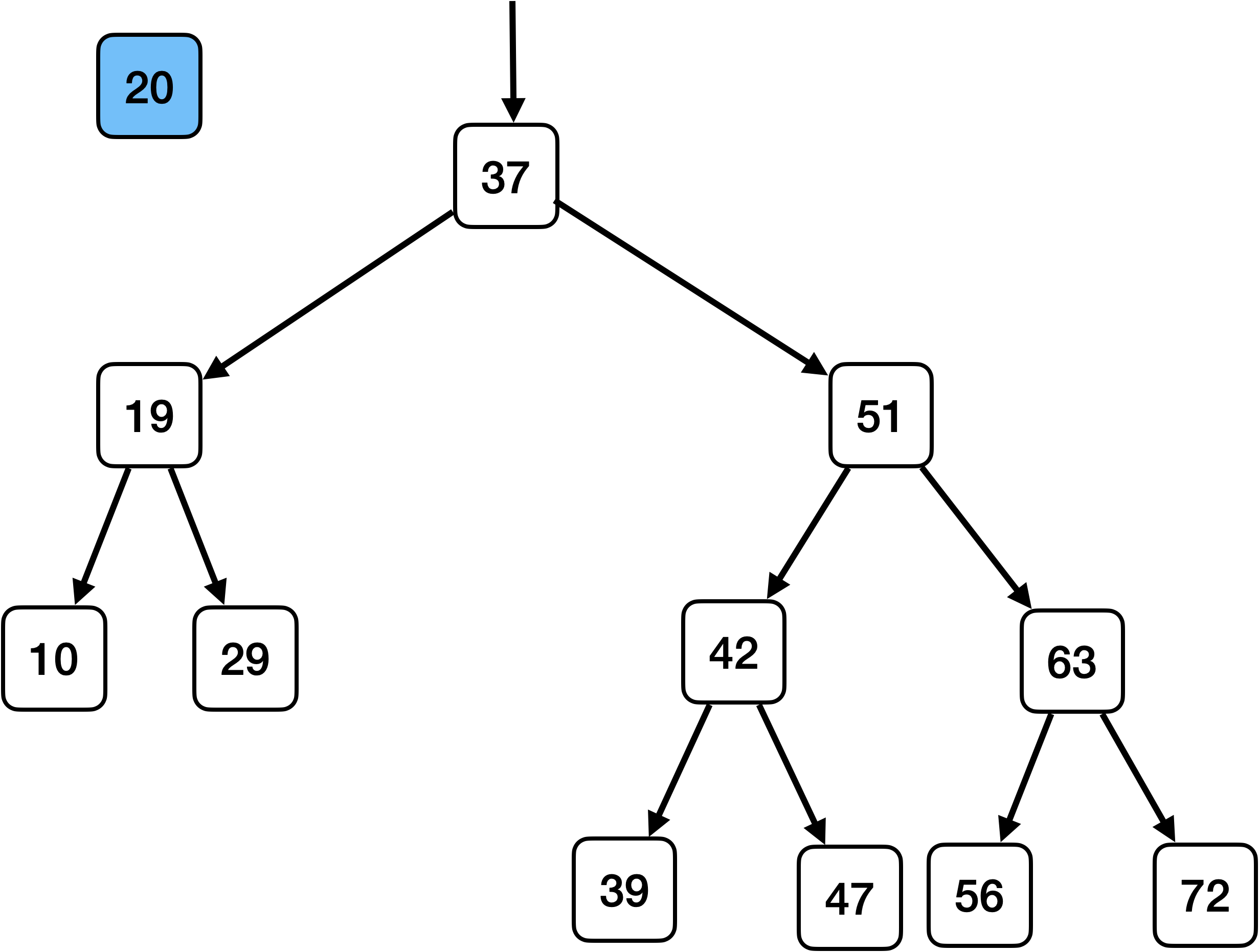 Our die roll told us that we didn't want to insert at the root of our tree. That means we're going to insert it somewhere in the left subtree, since 20 < 37.