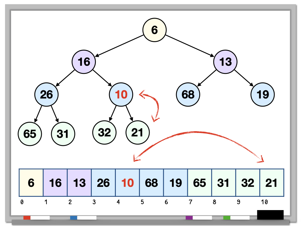 - Insert at the end of the last layer of the tree (which is the next available spot in the array).
