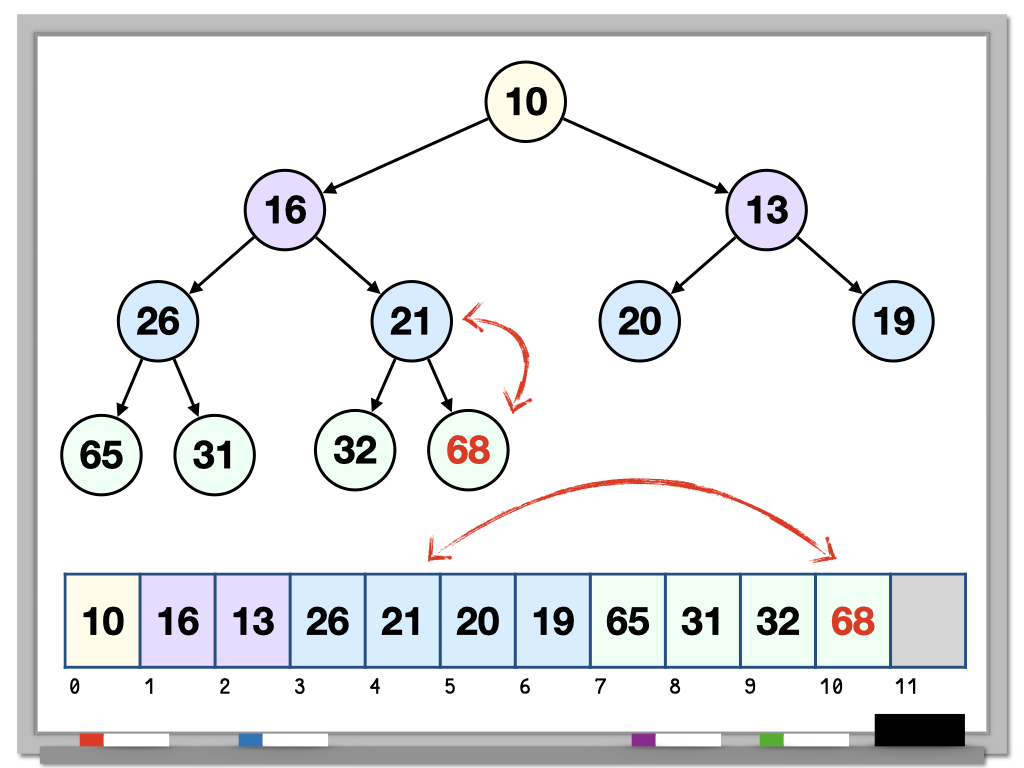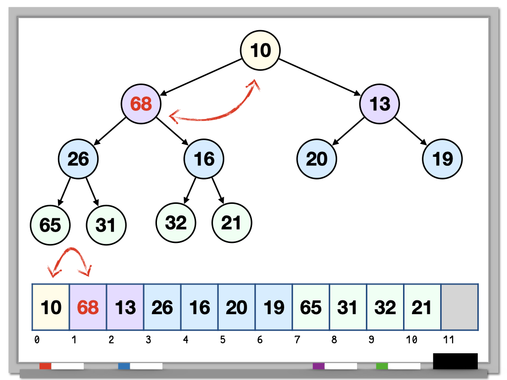 - Replace the root (index 0) with the last element in the heap (index n - 1).