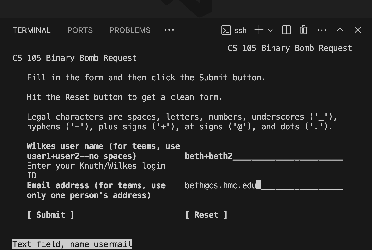 Each two-person team will attempt to defuse their own personalized bomb. Each bomb is a Linux binary executable file that has been compiled from a C program. To obtain your team's bomb, one (and only one) of the team members should follow these steps to acquire a bomb: