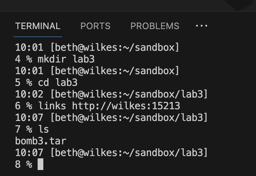 lsto confirm that your downloaded bombtarfile is in your directory. Notice that your bomb has a number (e.g.,bomb3) as shown below: