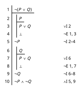 \(\lnot(P\lor Q)\ \ \vdash\ \ \lnot P\land \lnot Q\)