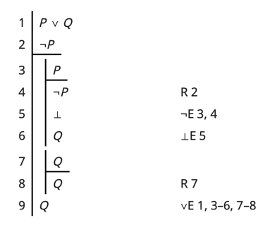 \(P\lor Q,\ \lnot P\ \ \vdash\ \ Q\)