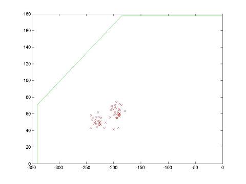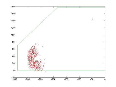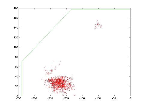 Here is a step through of the localization algorithm on a sample run, pictured above. The above picture was created by me drawing the path of the cart as I took data. In the pictures below, the left is the location particles generated by the localizing program, and the right is the raw data plotted as a series of vectors, end to end. The circles in the righthand plots are points on the bumper in sets of 3, one each at the left, right, and middle.