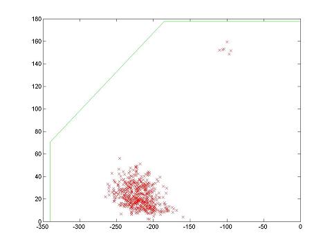 Here are the results after eight hits. The actual location of the hit was in the upper right corner with the cart facing north. The density of the cluster in the left plot is highest at the top, and this is pretty close to where the center of the cart was when its bumper hit the north wall. You can see from the right plot that the raw readings are starting to give a pretty skewed location. Taking this data I saw there was a fair amount of wheel slippage at hit 6 because the bumper hit the wall at an angle only slightly off of 90 degrees and flattened against it, destroying that small angle.