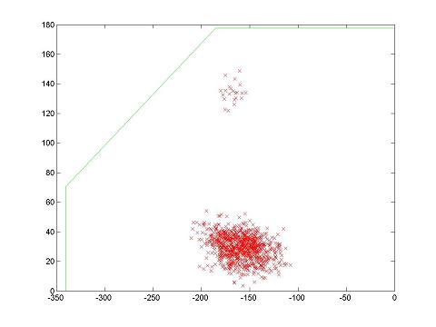 Here is hit 16, and it finally fails. The actual location should be where the small clump is. The last 5 moves or so were relatively small and this magnified the problems associated with having two clumps in almost symmetric locations. I believe if I continued the run with more hits, it would once again localize to the right spot. The accuracy tends to be cyclic, since good localizing only tends to happen after large moves that most completely differentiate one spot from another.