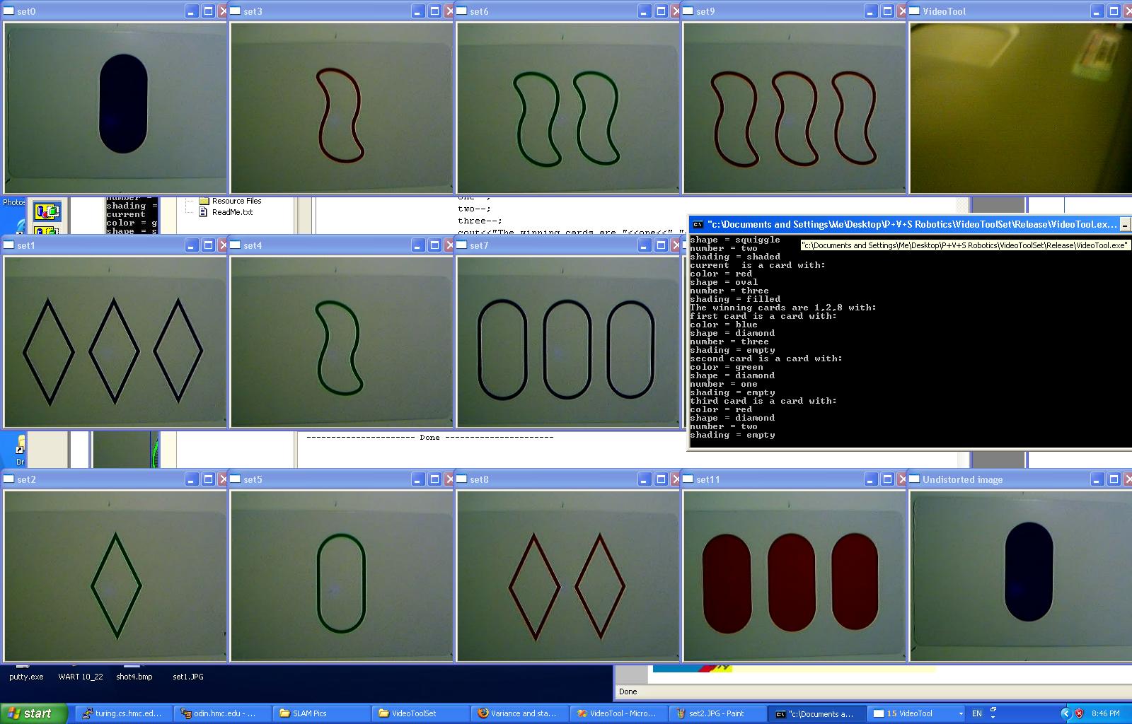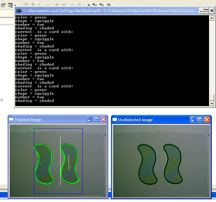 Color is fairly easy to determine for a picture of the card. The code simply adds up the number of pixels which register as each color, and then decides the color of the card based on that information. While there was a certain amount of parameter tuning because the lighting makes white turn up green, and blue is too close to black to be easily detected, this wasn't very difficult.