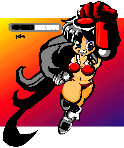 It's a cyborg girl. She's flying towards us doing a left uppercut.