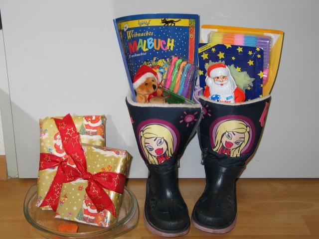Xandie's boots just after St. Nikolaus filled them up. It seems there wasn't quite enough room, so after feeding his donkey he put some extra presents in the dish that had held the carrots and oats.