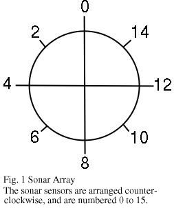 Our first goal was to program the Nomad to move around and avoid obstacles (low-level wall-avoidance). The approach we took was to test the short-range infrared sensors for nearby objects, and have the robot turn away from them. We only examine the front half of the infrared sensor array because we have the turret and wheels coordinated (i.e. the robot is always moving "forward," or away from obstacles detected by the rear array). We set a "threshold" variable to represent the closest the robot should get to an object without taking evasive action. When the robot has crossed this "threshold," it will slow and turn away from the object. The speed of rotation is inversely proportional to the distance from the object, and the forward velocity is directly proportional to the distance from the object. If infrared sensor 0 is triggered, the robot will slow dramatically as it approaches the obstacle and will turn counterclockwise. If infrared sensors 1 through 3 are triggered, the robot will slow somewhat and turn counterclockwise. Finally, if sonars 13 through 15 are triggered, the robot will slow somewhat and turn clockwise.