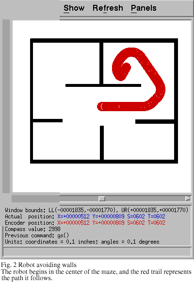 After the first week of work, the robot was able to avoid most obstacles, but had difficulty avoiding the corners of rectangular objects. At this point in our work, we had only programmed the low-level wall-avoiding behavior. Figure 1 shows the robot successfully avoiding walls, while Figure 2 shows the robot getting stuck on a corner. It seemed to be the case that the infrared sensors have difficulty detecting pointed objects, but we later discovered that there had been mistake in our reading of the sensors, and in fact we were not ever reading sensor 15. This was caused by the use of an incorrect offset value into the robot's State array, which resulted in reading all of the infrared sensors off by 1. This explains the robot hitting corners, because it always hit on the corner where sensor 15 would have detected the obstacle.
