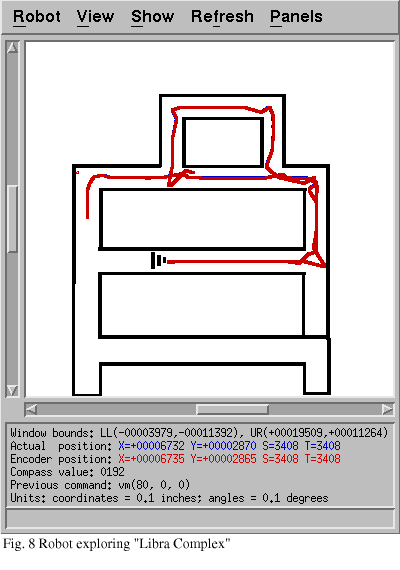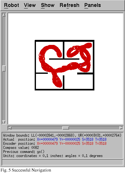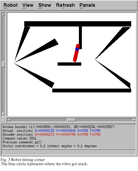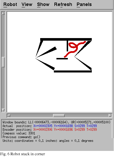 However, using the position-relative approach, the robot was able to explore a room without hitting obstacles (Fig. 5), although a problem arose when the robot got into a corner (Fig. 6). The primary problem is in the short-range wall-avoidance behavior. The robot senses the wall on its right, and begins to turn counterclockwise; it then senses the other wall on its left, and attempts to turn clockwise. As a result, the robot becomes "stuck" in the corner, attempting to turn first one way and then the other but never getting out. The problem is exacerbated by the corridor-centering technique, because the angled walls in the map led the robot to attempt to center itself between the angled walls, heading straight for the corner. When it got to the corner, the short-range behavior took over, and was unable to get out. This problem is still present in the final version of our programming although it is not always repeatable, and it appears to only be a problem when navigating between sharply angled walls.